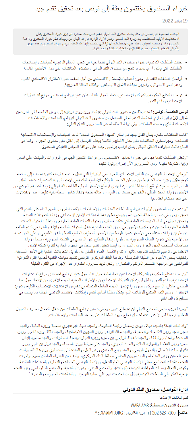 البيان الختامي لبعثة خُبراء صُندوق النّقد الدّولي إلى تُونس في يوليو 2022