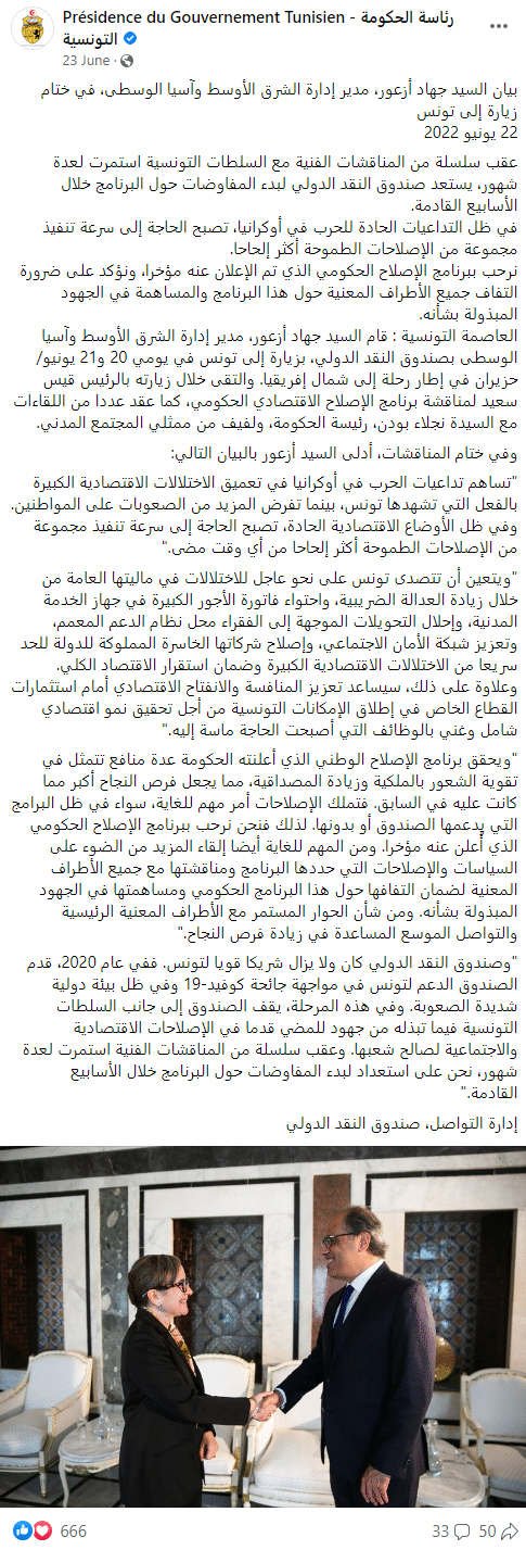جاء ذلك عقب سلسلة من الاجتماعات والمناقشات الفنيّة بين الطّرفين استمرّت لشهور، وفق بيان أدلى به جهاد أزعور، مدير إدارة الشّرق الأوسط وآسيا الوسطى بصندوق النّقد الدّولي، في اختتام زيارة إلى تونس يومي 20 و21 يونيو 2022، عقد خلالها سلسلة من اللقاءات مع الرئيس قيس سعيّد ورئيسة الحكومة نجلاء بودنّ بالإضافة إلى ممثلين عن المُجتمع المدنيّ لمناقشة برنامج الإصلاح الاقتصادي الحكومي.