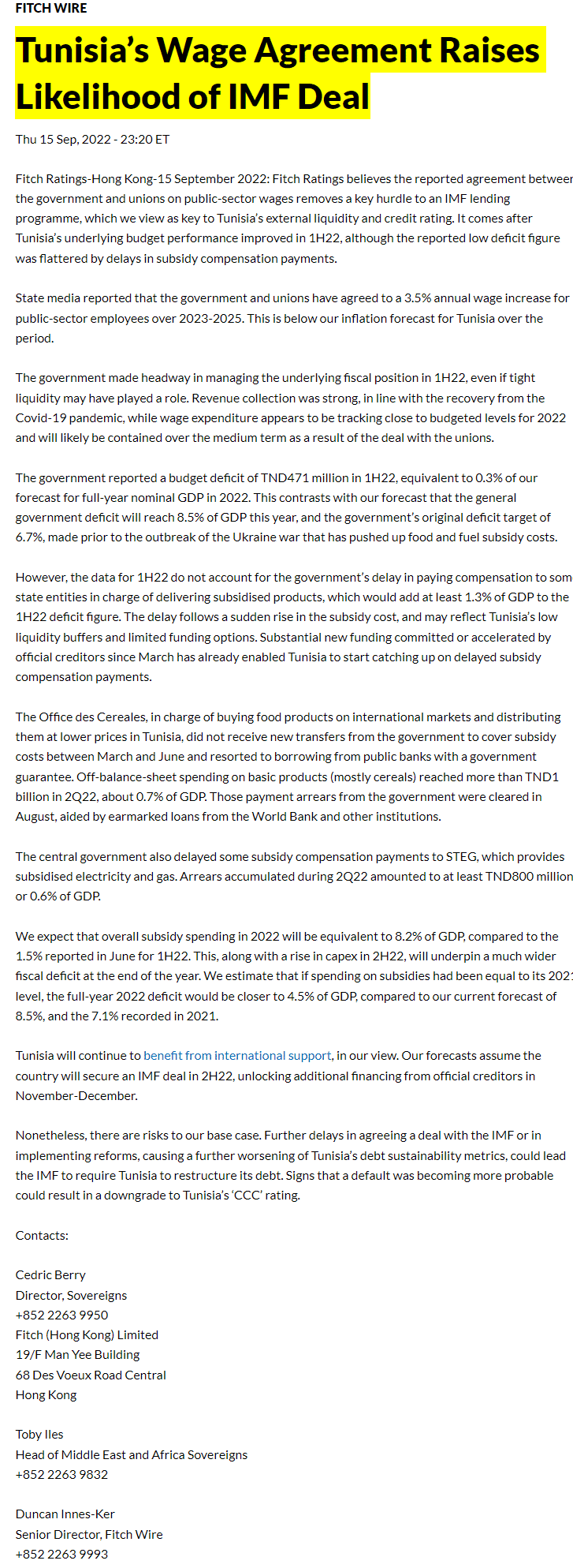 15 سبتمبر 2022.. فيتش رايتنجس: اتفاقية الأجور في تونس تزيد احتمالية إبرام صفقة مع صندوق النقد.