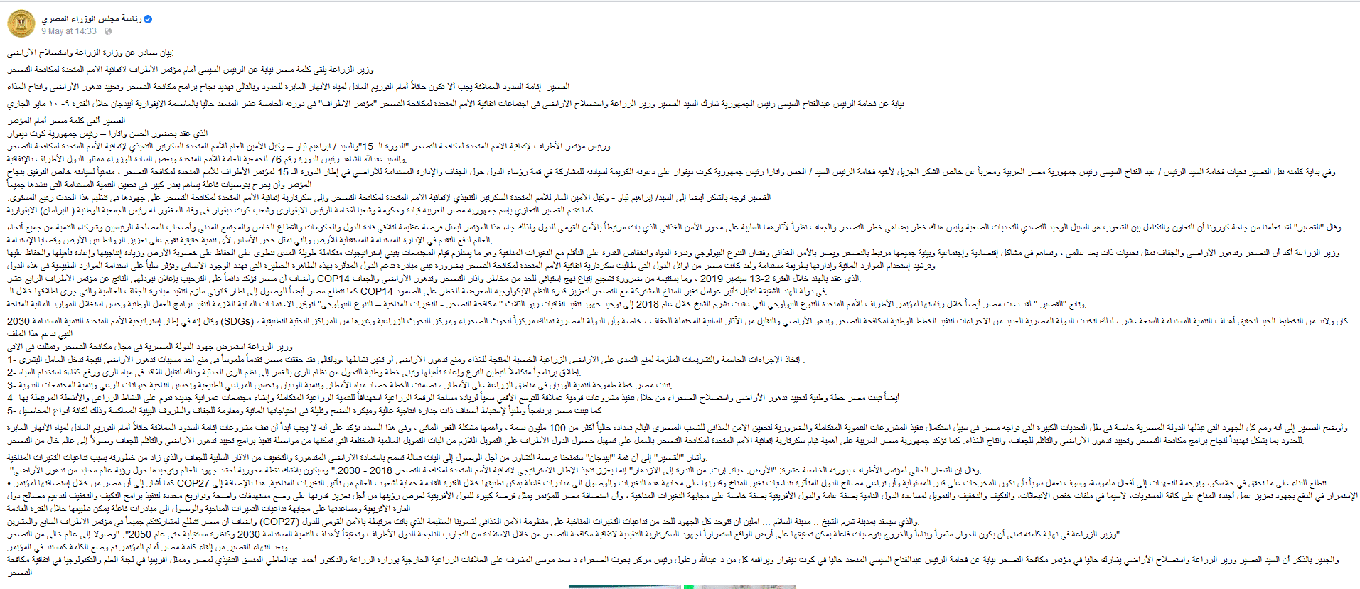 كلمة وزير الزراعة باجتماعات اتفاقية الأمم المتحدة لمكافحة التصحر