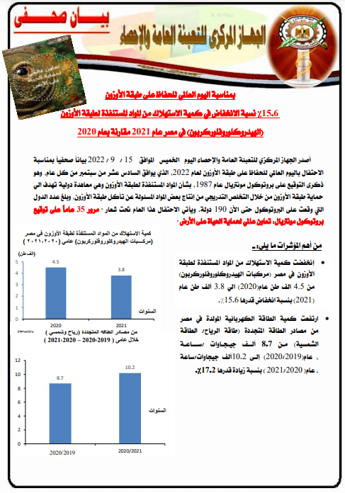 انخفضت كمية الاستهلاك من المواد المستنفذة لطبقة الأوزون في مصر "مركبات الهيدروكلوروفلوركربون" من 4.5 ألف طن عام 2020 إلى 3.8 ألف طن عام 2021 بنسبة تراجع بلغت 15.6%، وفقًا لبيان الجهاز المركزي للتعبئة العامة والإحصاء.