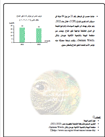 أعلن الجهاز المركزي للتعبئة العامة والإحصاء، في اليوم العالمي للحفاظ على طبقة الأوزون لعام 2022، في 15 سبتمبر 2022، وصول مصر للمرتبة 21 في مؤشر أداء تغير في المناخ لعام 2022، من بين 64 دولة وهو مؤشر يهدف إلى تقييم السياسات والبرامج المتبعة في الدول المختلفة لمواجهة تغير المناخ ويصدر عن منظمة البيئة والتنمية الألمانية "German Watch"، ومع اقتراب مؤتمر المناخ "COP27" بمحافظة شرم الشيخ، فما القصة؟