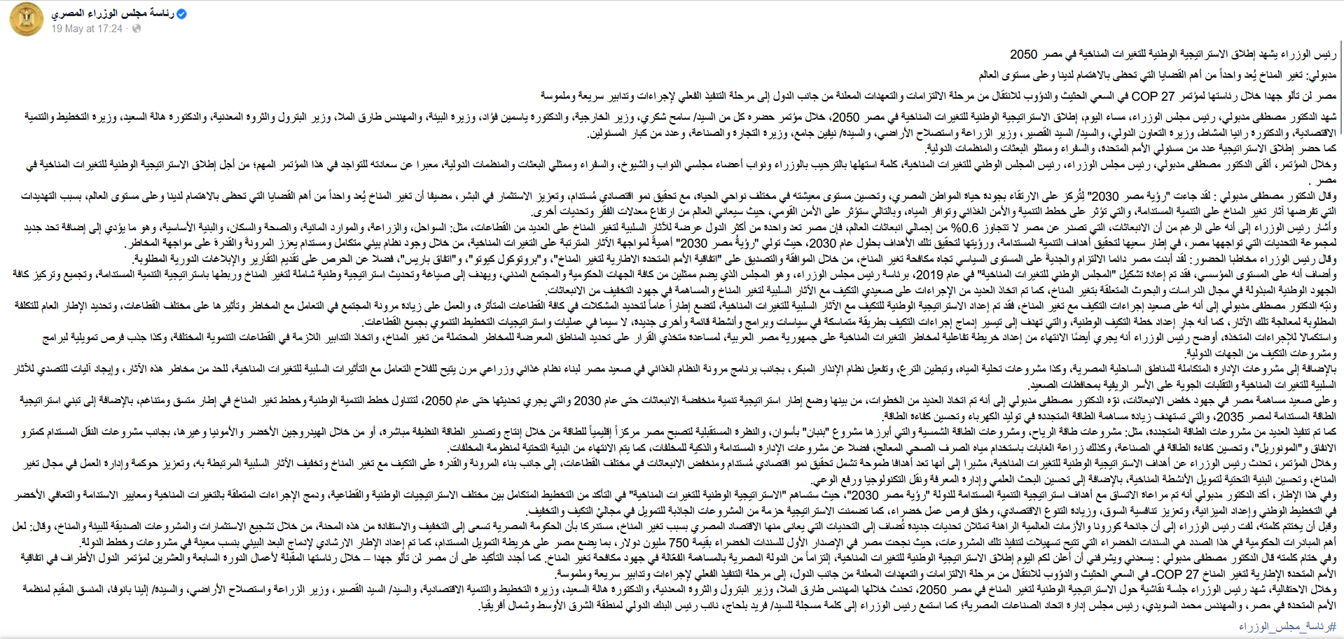 في ذات اليوم، نوّه الدكتور مصطفى مدبولي، رئيس مجلس الوزراء المصري، أنه على صعيد مساهمة مصر في جهود خفض الانبعاثات فإن مصر اتخذت العديد من الخطوات، من بينها وضع إطار استراتيجية تنمية منخفضة الانبعاثات حتى عام 2030 والتي يجري تحديثها حتى عام 2050، لتتناول خطط التنمية الوطنية وخطط تغير المناخ في إطار متسق ومتناغم، بالإضافة إلى تبني استراتيجية الطاقة المستدامة لمصر 2035، والتي تستهدف زيادة مساهمة الطاقة المتجددة في توليد الكهرباء وتحسين كفاءة الطاقة.
