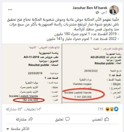 نشر زياد الهاشمي، النائب في البرلمان التونسي المنحل، تدوينة عبر صفحته على موقع فيسبوك، قال فيها إن تكلفة اللحوم الحمراء للقصر الرئاسي لسنة 2022 بلغت مليار و141 مليون دينارًا، وذلك يوم 24 سبتمبر 2022.
