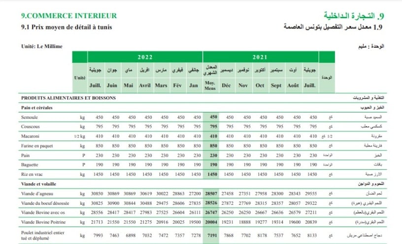 وبحسب النشرة الشهرية للإحصائيات، يوليو 2022، والصادرة عن المعهد الوطني للإحصاء، تطورت أسعار اللحوم الحمراء خلال الأشهر الـ7 الأولى، حيث كانت تتراوح أسعار اللحوم الحمراء باختلاف أنواعها بين 19 و30 دينارًا للكيلو جرام.