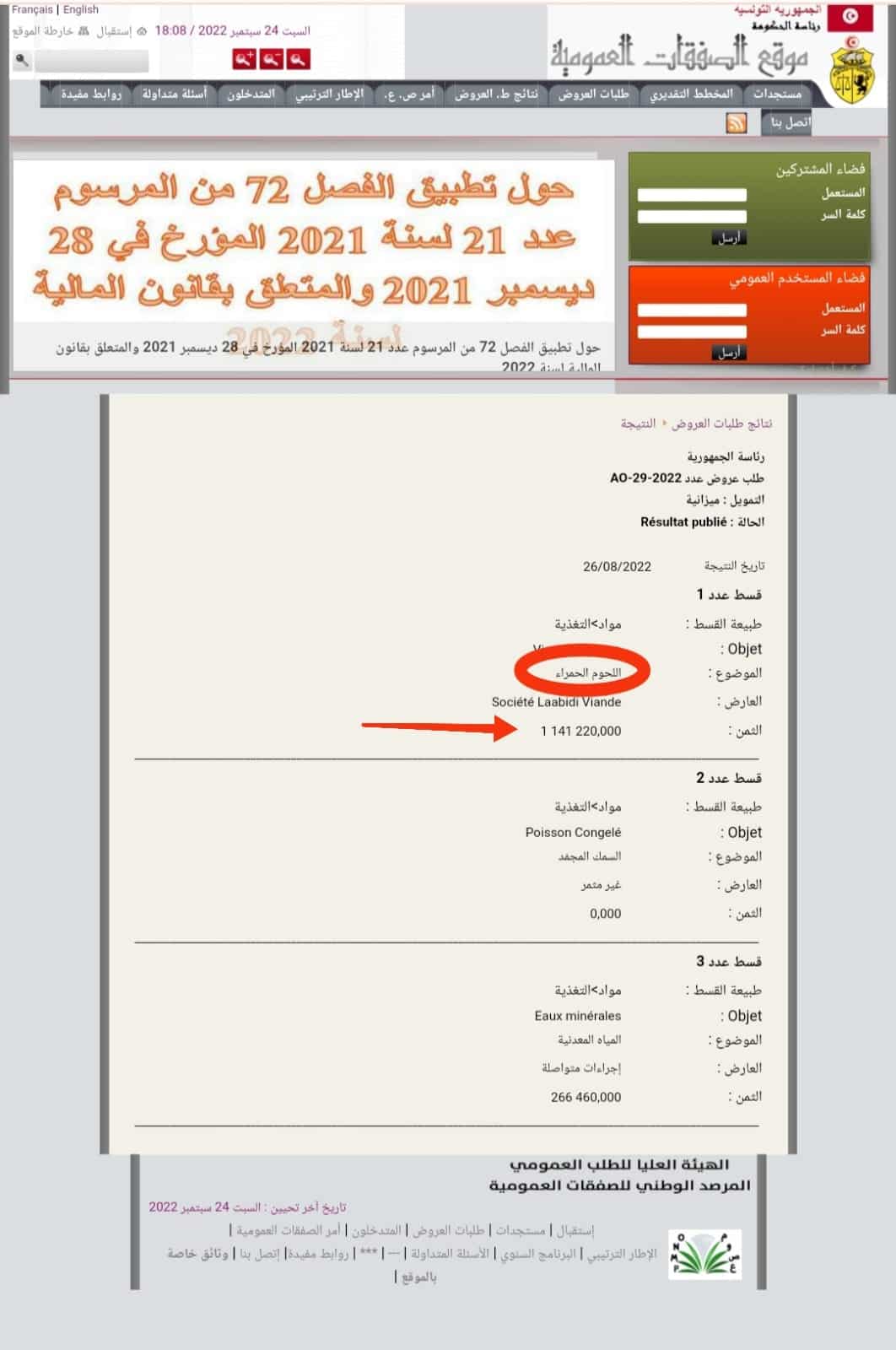 تم رصد مبلغ مليار و141 مليونًا و220 ألف دينارًا تونسيًا للحوم الحمراء، لصالح شركة العبيدي للحوم، ومبلغ 460 مليونًا و266 دينارًا للمياه المعدنية، في حين السمك المجمد لم يتوصل إلى سعر بعد، وذلك كما هو موضّح في الوثيقة المنشورة على موقع المرصد التونسي للصفقات.