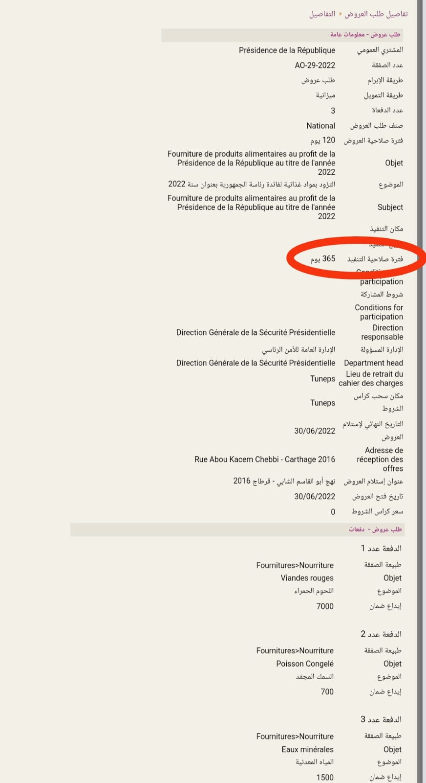 وفي تفاصيل أكثر عن الصفقة، طرحت رئاسة الجمهورية مناقصة بغرض التزود بمواد غذائية لصالحها في 2022، على أن يتم دفع المبلغ على دفعات، بفترة صلاحية 365 يومًا، لتكفي كمية اللحوم الحمراء لمدة سنة كاملة.