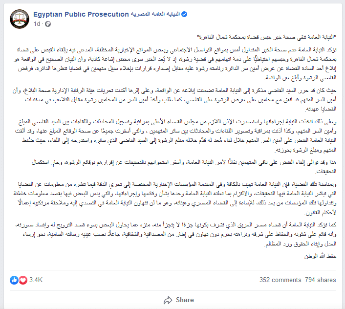 النيابة المصرية تنفي القبض على قضاة بمحكمة شمال القاهرة لاتهامهم بالرشوة.. ومع الانتشار الواسع للخبر على مواقع التواصل الاجتماعي قررنا التحري