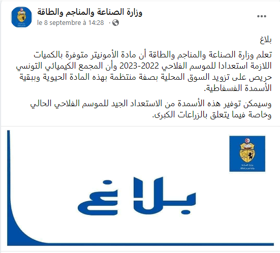 وهو ما ادعته الوزارة في وقت سابق أيضًا، حيث ذكرت أن مادة الأمونيتر متوفرة بالكميات اللازمة استعدادًا للموسم الفلاحي 2022 – 2023، وأن المجمع الكيميائي التونسي حريص على تزويد السوق المحلية بصفة منتظمة بهذه المادة الحيوية وببقية الأسمدة، وأنه سيمكن توفير هذه الأسمدة ضمن الاستعدادات للموسم الفلاحي الحالي وخاصة فيما يتعلق بالزراعات الكبرى، وذلك وفق بيان نشر عبر صفحة الوزارة على موقع فيسبوك يوم 8 سبتمبر 2022.