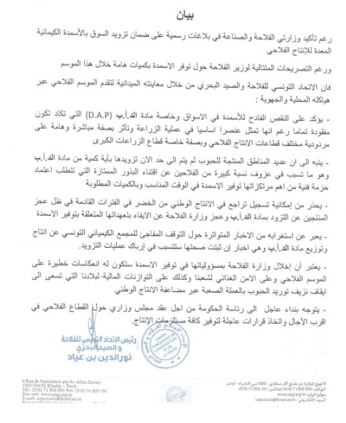 وساقنا البحث لبيان صادر عن الاتحاد التونسي للفلاحة والصيد البحري يوم 22 سبتمبر 2022، أكد فيه تسجيل نقص "فادح" للأسمدة في الأسواق وخاصة مادة ثلاثي فسفاط الأمونيوم "دي.أي.بي"، على عكس تصريحات وزارتي الفلاحة والصناعة حول توفر الأسمدة بكميات كافية خلال هذا الموسم وضمان تزويد السوق بها.
