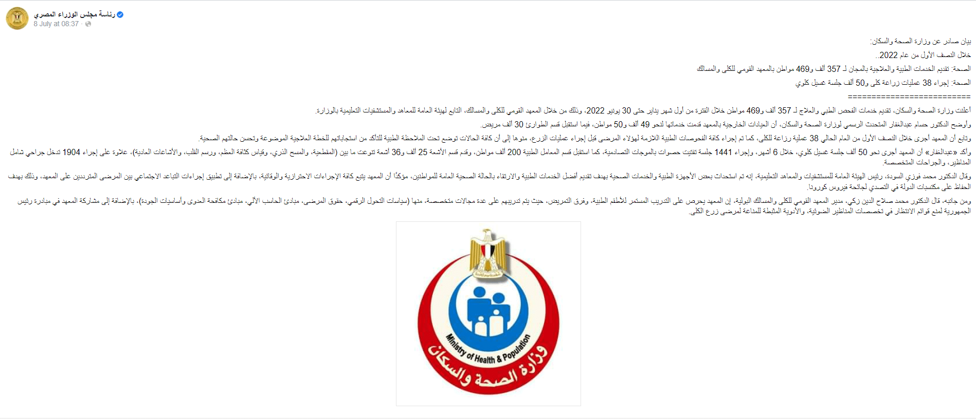 أكد المُتحدث الرسمي لوزارة الصحة، يوم 8 يوليو 2022، أن المعهد القومي للكلى والمسالك، التابع للهيئة العامة للمعاهد والمستشفيات التعليمية بالوزارة أجرى خلال النصف الأول من عام 2022، عدد 38 عملية زراعة للكلى، كما تم إجراء كل الفحوصات الطبية اللازمة لهؤلاء المرضى قبل إجراء عمليات الزرع، منوهًا إلى أن جميع الحالات توضع تحت الملاحظة الطبية للتأكد من استجاباتهم للخطة العلاجية الموضوعة وتحسن حالتهم الصحية.