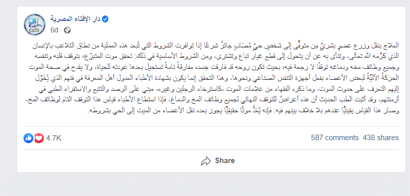 وفي إطار ذلك أعلنت دار الإفتاء المصرية، خلال بيانٍ لها يوم 25 سبتمبر 2022، أن "العلاج بنقل وزرع عضو بشري من متوفي إلى شخص حي مصاب جائز شرعًا، إذا توافرت الشروط التي تبعد هذه العملية من نطاق التلاعب بالإنسان الذي كرمه الله تعالى وتنأى به عن أن يتحول لقطع غيار تباع وتشترى".