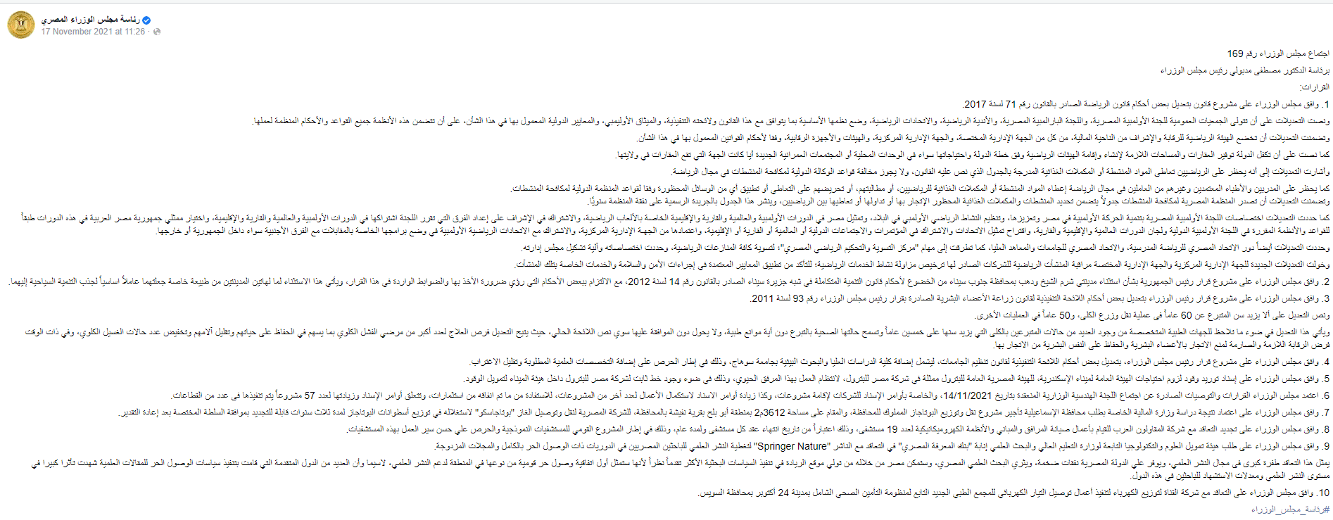 في نوفمبر 2021، وافق مجلس الوزراء على مشروع قرار رئيس الوزراء بتعديل بعض أحكام اللائحة التنفيذية لقانون زراعة الأعضاء البشرية الصادرة بقرار رئيس مجلس الوزراء رقم 93 لسنة 2011، ونص التعديل على ألا يزيد سن المتبرع عن 60 عامًا في عملية نقل وزرع الكلى، و50 عامًا في العمليات الأخرى.