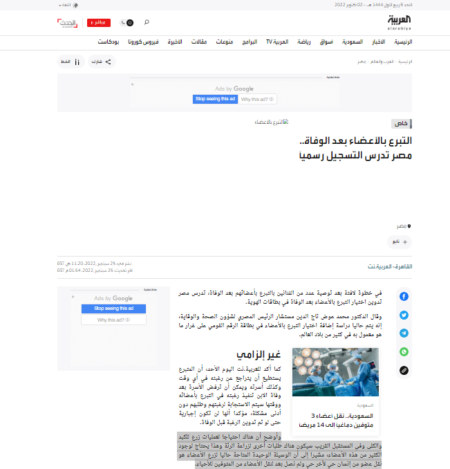 في 25 سبتمبر 2022، قال الدكتور محمد عوض تاج الدين مستشار الرئيس لشؤون الصحة والوقاية لـ"العربية"، إنه يتم حاليًا دراسة إضافة اختيار التبرع بالأعضاء في بطاقة الرقم القومي على غرار ما هو معمول به في كثير من بلاد العالم.