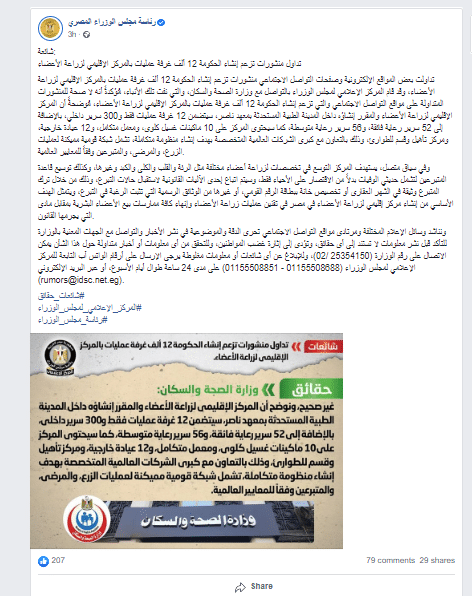 نفت وزارة الصحة والسكان المصرية إنشاء الحكومة 12 ألف غرفة عمليات بالمركز الإقليمي لزراعة الأعضاء، مُوضحةً أن المركز المقرر إنشائه داخل المدينة الطبية المستحدثة بمعهد ناصر، سيتضمن 12 غرفة عمليات فقط، وذلك خِلال بيانٍ نُشر بالصفحة الرسمية لرئاسة مجلس الوزراء في موقع "فيسبوك"، يوم 2 أكتوبر2022.