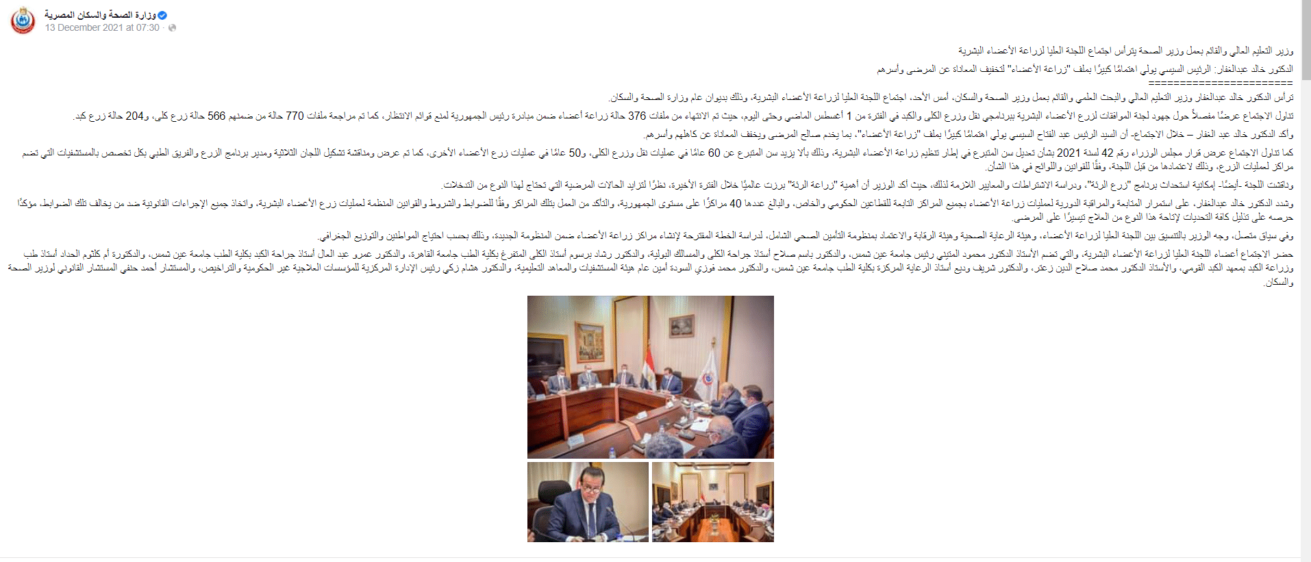 وكان تم عرض مفصل حول جهود لجنة الموافقات لزراعة الأعضاء البشرية ببرنامجي نقل وزراعة الكلى في الفترة من أول أغسطس 2021، في 13 ديسمبر 2021، حيث تم الانتهاء من ملفات 376 حالة زراعة أعضاء ضمن مبادرة رئيس الجمهورية لمنع قوائم الانتظار، ومراجعة ملفات 770 حالة من ضمنهم 566 حالة زراعة كلى و204 زرع كبد.