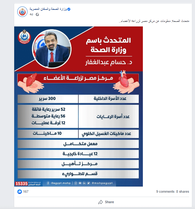 وأوضح في اليوم ذاته المُتحدث باسم وزارة الصحة عبر الصفحة الرسمية للوزارة في "فيسبوك"، معلومات عن مركز مصر لزراعة الأعضاء وأن عدد الأسرة الداخلية 300 سرير وعدد أسرة الرعايات 52 سرير رعاية فائقة و56 رعاية متوسطة و12 غرفة عمليات، و10 ماكينات غسيل الكلوي، ومعمل متكامل و12 عيادة خارجية، ومركز تأهيل، وقسم طوارئ.