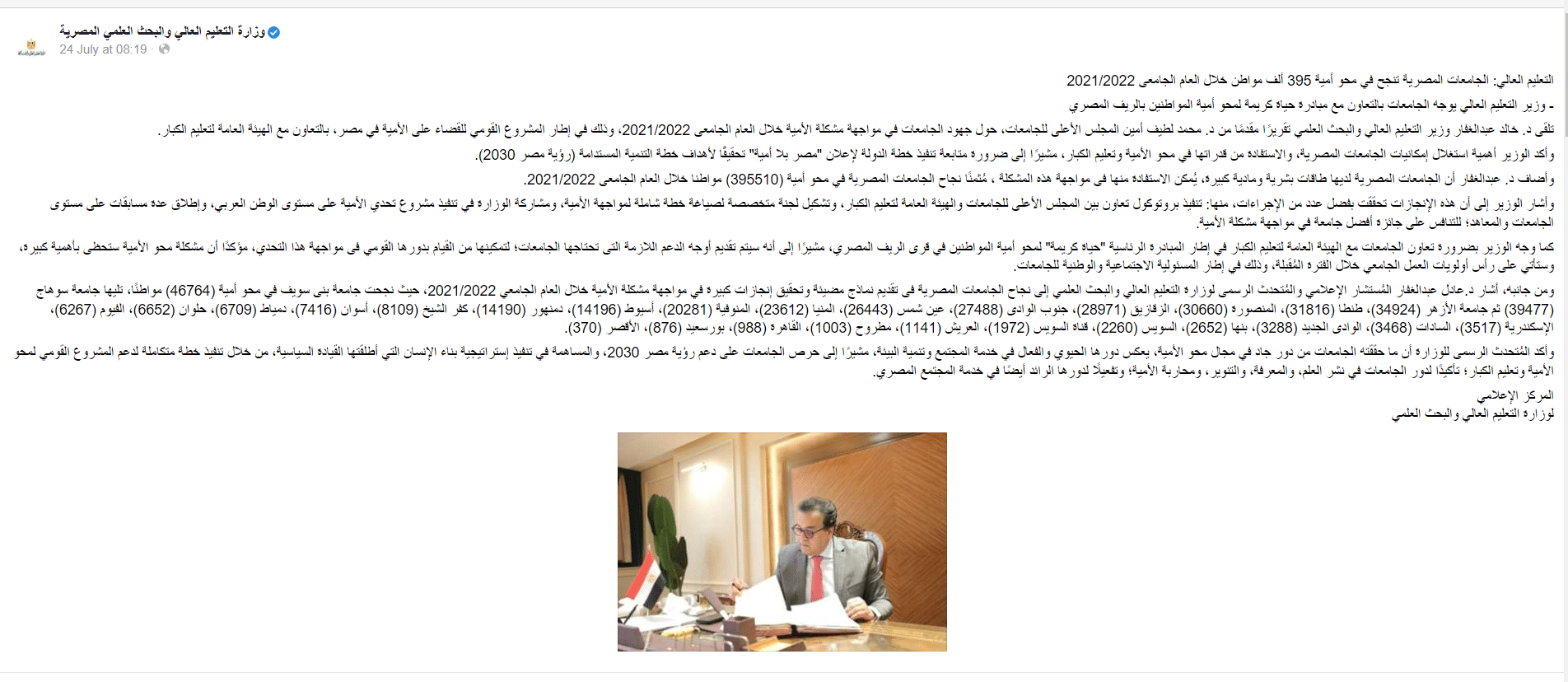 في 24 يوليو 2022، أعلن الدكتور خالد عبد الغفار وزير التعليم العالي والبحث العلمي وقتها عبر بيانٍ بالصفحة الرسمية للوزارة في "فيسبوك" أن الجامعات المصرية نجحت في محو أمية 395 ألف مواطنًا خِلال العام الجامعي 2021 ـ 2022، وذلك خِلال تقرير مقدم من الدكتور محمد لطيف أمين المجلس الأعلى للجامعات، في إطار المشروع القومي للقضاء على الأمية في مصر، بالتعاون مع الهيئة العامة لتعليم الكبار.