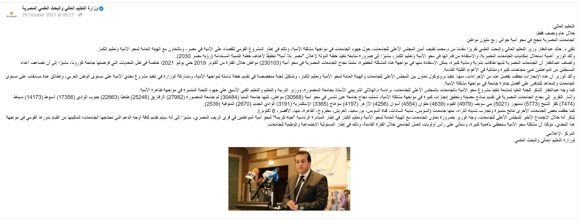 وفي 29 أكتوبر 2021، أعلن وزير التعليم العالي والبحث العلمي تلقيه تقريرًا مقدمًا من الدكتور محمد لطيف أمين المجلس الأعلى للجامعات، حول جهود الجامعات في مواجهة مشكلة الأمية، يكشف نجاح الجامعات في محو أمية 230 ألفًا و103 مواطنين خِلال الفترة من أكتوبر 2019 حتى يوليو 2021.