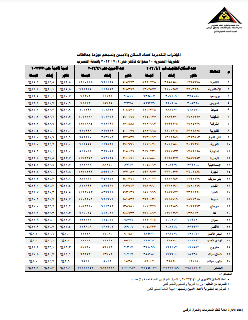 ومع استمرار البحث، وجدنا بيانات للهيئة العامة لتعليم الكبار ومحو الأمية، كشفت عن مؤشرات تقديرية عن أعداد الأميين ونسبتهم في الشريحة العمرية "10 سنوات فأكثر" حتى 1 يوليو 2022، بإضافة التسرب من التعليم، تؤكد أن العدد 17 مليونًا و113 ألفًا و343 شخصًا بنسبة 22.1%.