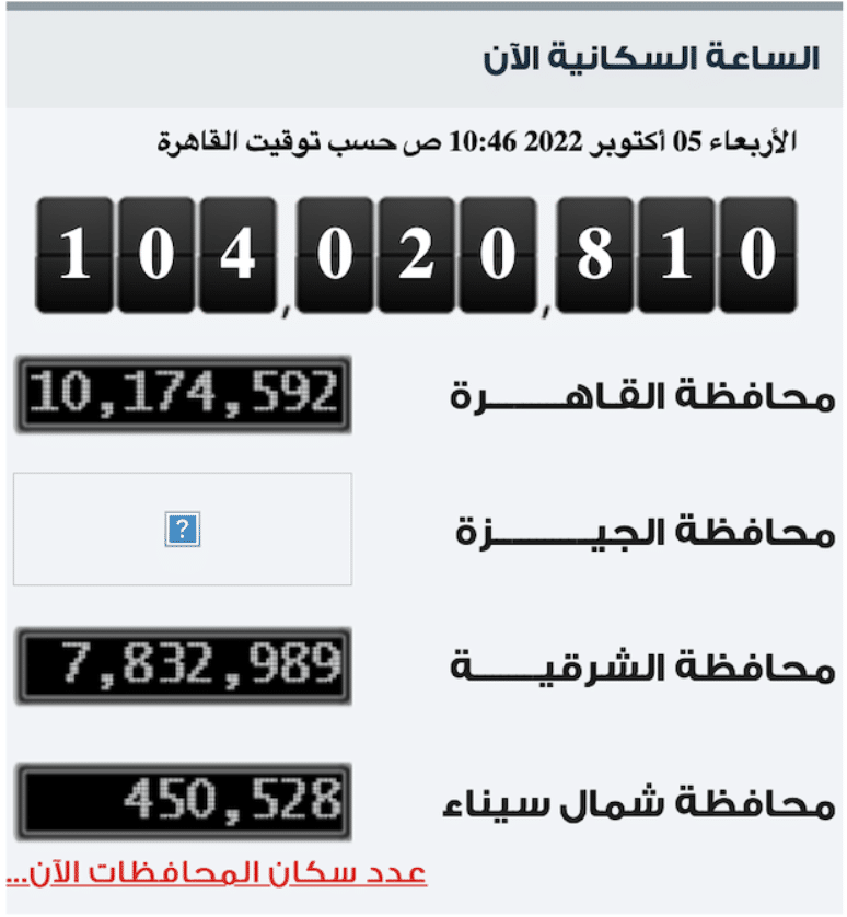 وبالرجوع للإحصاء لمراجعة التعداد السكاني الحالي، وجدنا أن عدد السكان بلغ حوالي 104 ملايين نسمة في يوم 5 أكتوبر 2022.