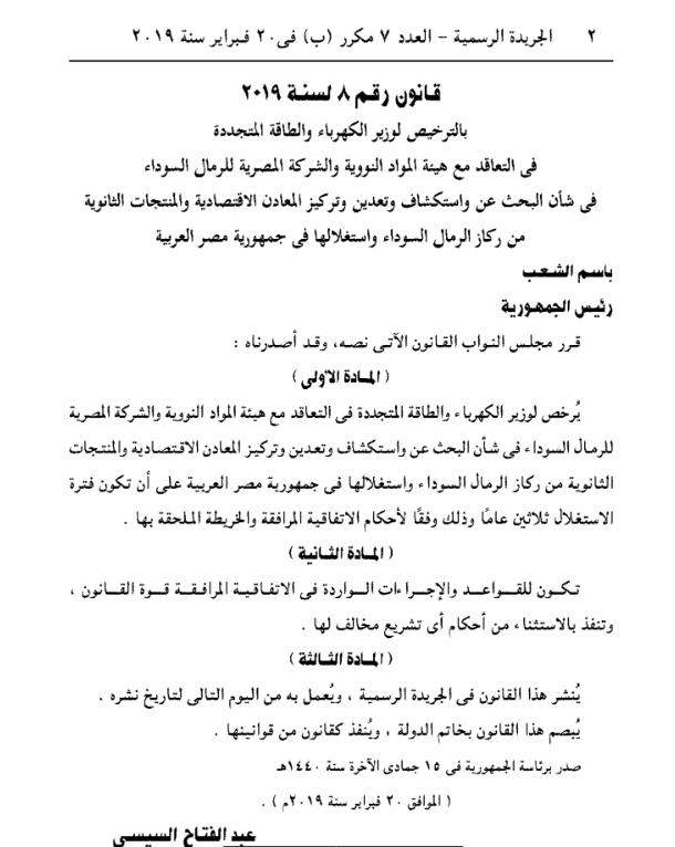 بيان الصفحة الرسمية للمتحدث العسكري للقوات المسلحة وفي فبراير 2019، أصدر رئيس الجمهورية الموافقة على قرار بالترخيص لوزارة الكهرباء والطاقة المتجددة في التعاقد مع هيئة المواد النووية والشركة المصرية للرمال السوداء، بشأن البحث واستكشاف وتعدين وتركيز المعادن الاقتصادية والمنتجات الثانوية من ركاز الرمال السوداء، واستغلالها في مصر على أن تكون فترة استغلالها 30 عامًا.