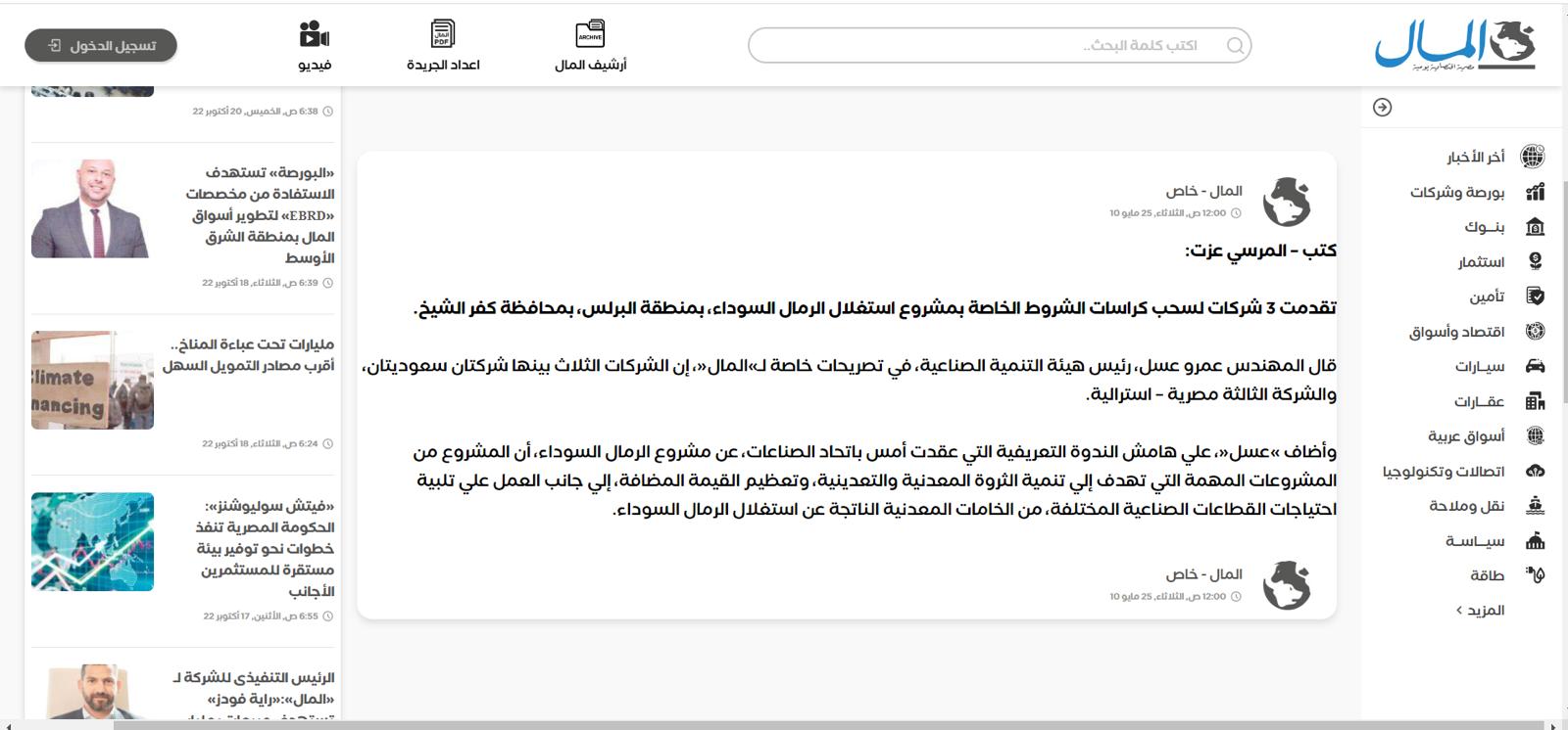 تصريح الهيئة العامة للتنمية الصناعية وفي مايو 2010، قال المهندس عمرو عسل، رئيس هيئة التنمية الصناعية وقتها، في تصريحات خاصة لـ"جريدة المال"، إن 3 شركات تقدموا لسحب كراسات الشروط الخاصة بمشروع استغلال الرمال السوداء، بمنطقة البرلس في محافظة كفر الشيخ، بينها شركتان سعوديتان، والشركة الثالثة مصرية – استرالية.