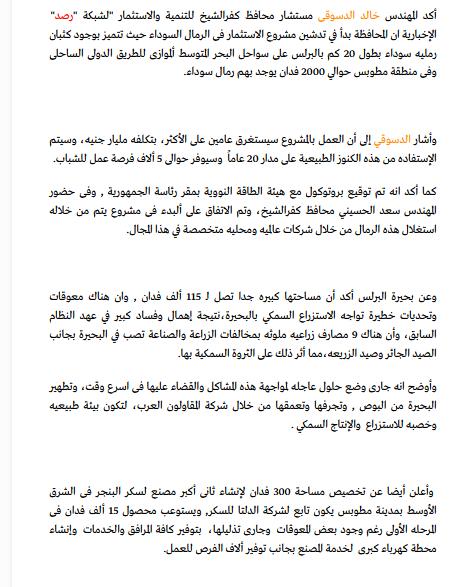 تصريحات صحفية وفي أكتوبر 2013، أعلن اللواء عادل لبيب، وزير التنمية المحلية وقتها، أنه سيتم البدء فورًا في تنفيذ مشروع استغلال الرمال السوداء بكفر الشيخ شرق منطقة برج البرلس، بالتعاون بين هيئة المواد النووية والمحافظة، وهو ما نشرته مواقع "اليوم السابع، والمصري اليوم". [gallery jnewsslider_title="قرار وزير التنمية المحلية المصري" size="full" columns="2" ids="12741,12742"] مشروع الرمال السوداء بعد تولي السيسي رئاسة الجمهورية: وبعد تولي الرئيس عبد الفتاح السيسي، رئاسة الجمهورية، أعلن الدكتور أسامة حمدي عبد الواحد، محافظ كفرالشيخ في مارس 2015، إنشاء مصنع للرمال السوداء، لاستخراج المعادن الموجودة بهذه الرمال، وفقًا لما نشرته "اليوم السابع، والمصري اليوم". [gallery size="full" columns="2" jnewsslider_title="تصريحات محافظ كفر الشيخ" ids="12743,12744"] وفي نوفمبر 2015، كشف الدكتور مصطفى القاضي رئيس الشركة المصرية للثروات التعدينية، في تصريحات خاصة لـ"اليوم السابع" أنه تم المشاركة في الشركة الوطنية للرمال السوداء مع جهاز التعدين التابع للقوات المسلحة وهيئة المواد النووية وبنك الاستثمار القومي ومحافظة كفر الشيخ.