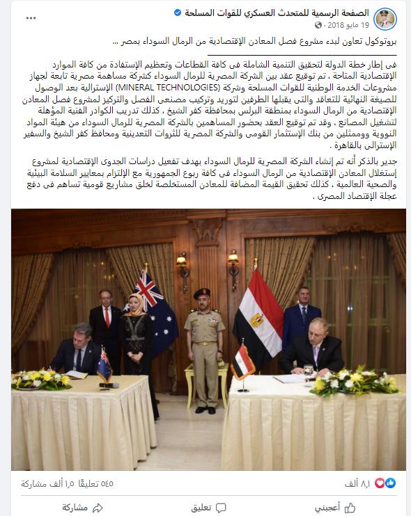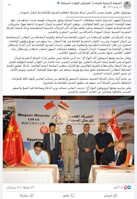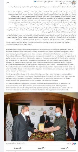 بيان الصفحة الرسمية للمتحدث العسكري للقوات المسلحة وفي يونيو 2018، وقعت الشركة المصرية للرمال السوداء التابعة لجهاز مشروعات الخدمة الوطنية للقوات المسلحة، مذكرة تفاهم مع إحدى أكبر الشركات الصينية المتخصصة، وذلك لإنشاء الشركة المصرية الصينية للرمال السوداء بالشراكة بين الجانبين المصري والصيني.