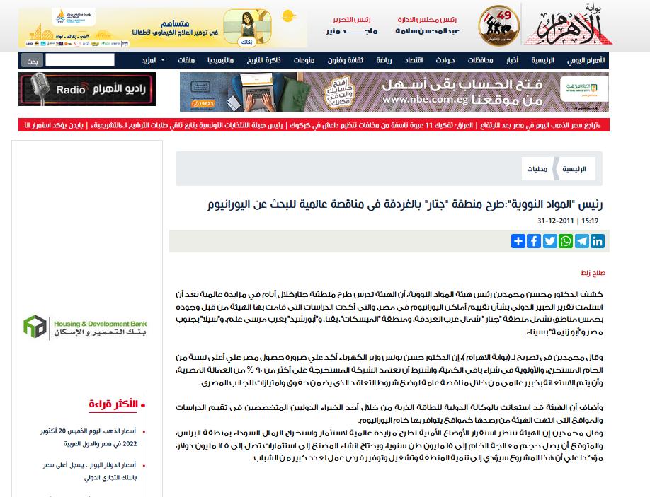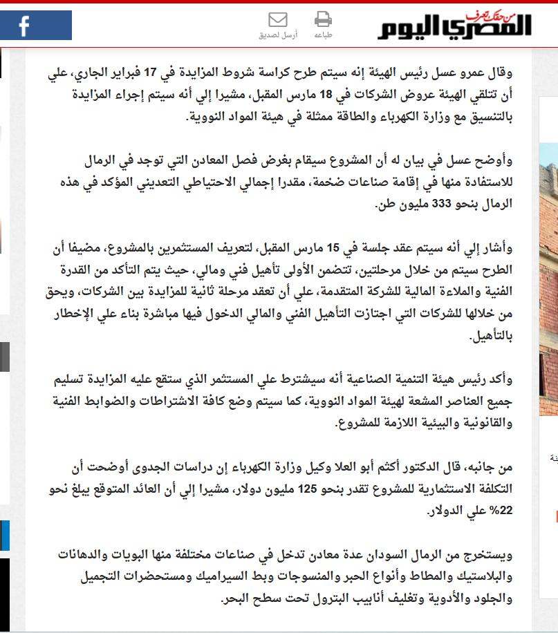 تصريحات رئيس هيئة المواد النووية وفي 9 فبراير 2013، وافق الرئيس المصري في وقتها الدكتور محمد مرسى على إنشاء كيان اقتصادي حكومي للاستفادة من المواد الخام بالرمال السوداء.