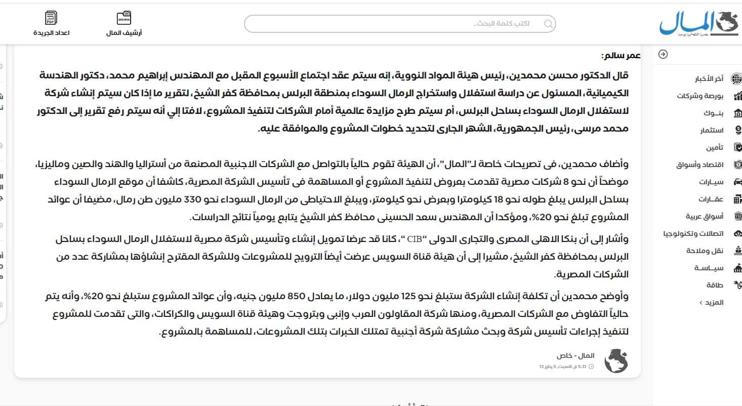 تصريحات رئيس هيئة المواد النووية عام 2013 وفي 5 يناير 2013، قال الدكتور محسن محمدين، رئيس هيئة المواد النووية، في تصريحات لـ "المال"، إنه سيتم عقد اجتماع، لتقرير ما إذا كان سيتم إنشاء شركة لاستغلال الرمال السوداء بساحل البرلس، أم سيتم طرح مزايدة عالمية أمام الشركات لتنفيذ المشروع، لافتًا إلى أنه سيتم رفع تقرير إلى محمد مرسي رئيس الجمهورية وقتها، خلال شهر فبراير 2013. وأكد أن الهيئة تقوم حاليًا بالتواصل مع الشركات الأجنبية المصنعة من أستراليا والهند والصين وماليزيا، مشيرًا إلى أن 8 شركات مصرية تقدمت بعروض لتنفيذ المشروع أو المساهمة في تأسيس الشركة المصرية.