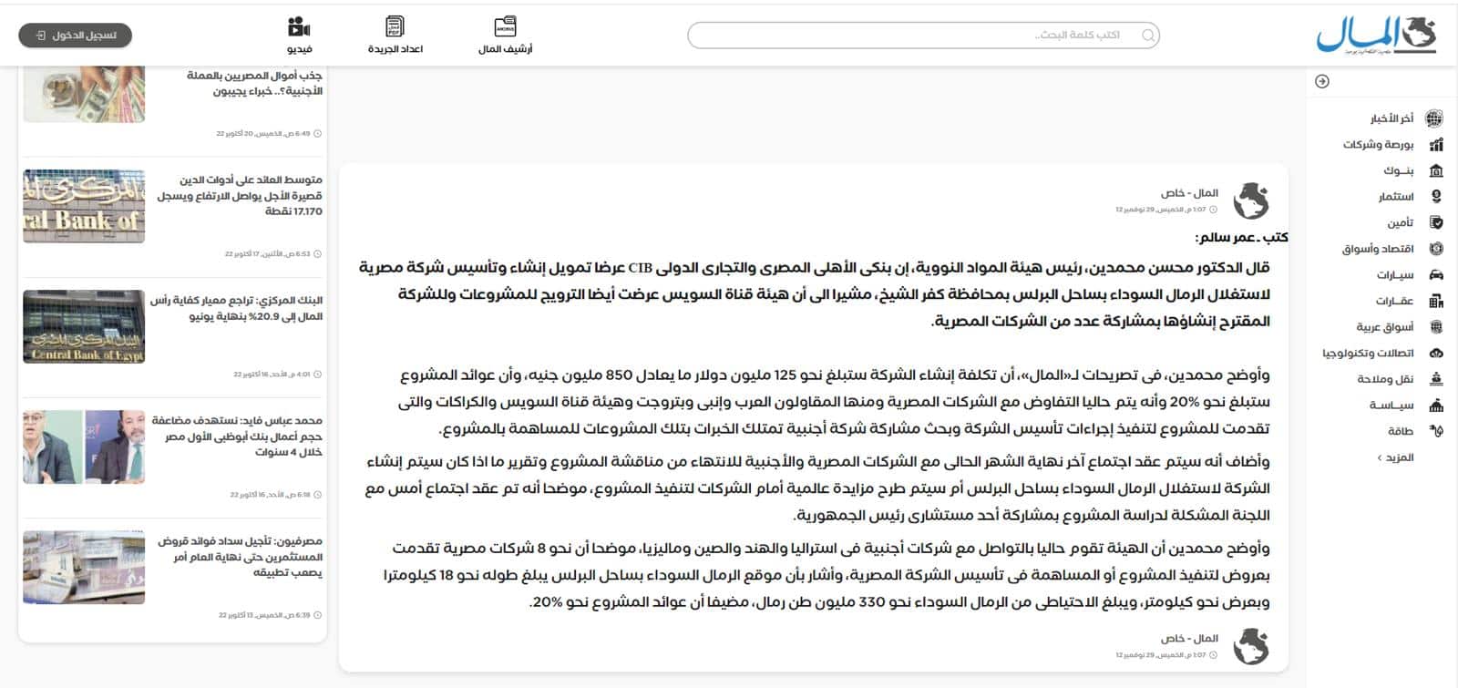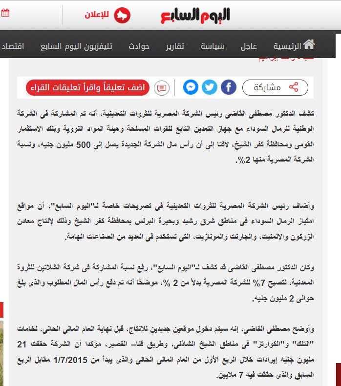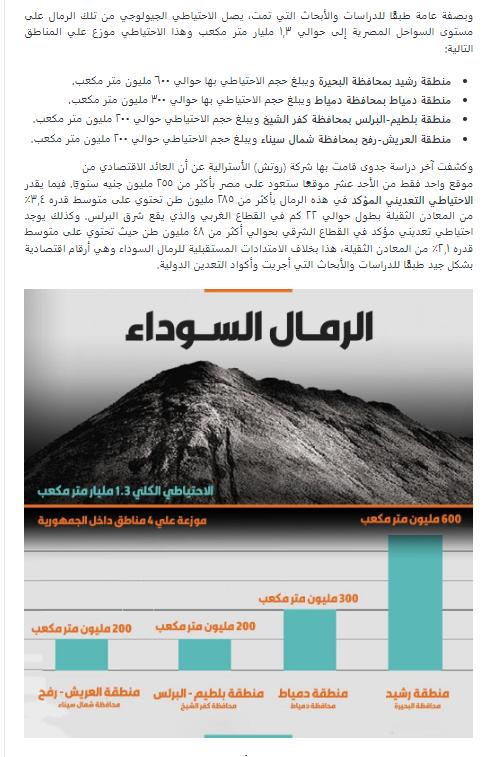 تصريحات رئيس الشركة المصرية للثروات التعدينية وفي يناير 2016، وافق مجلس الوزراء على الطلب الخاص بالترخيص لوزارة الكهرباء والطاقة المتجددة، بتأسيس شركة وطنية مصرية بمسمى "الشركة المصرية للرمال السوداء"، وذلك طبقًا لأحكام القانون رقم 159 لسنة 1981، نُشر عبر مواقع "المصري اليوم، وجريدة المال". [gallery jnewsslider_title="قرار مجلس الوزراء المصري " columns="2" size="full" ids="12746,12747"] وفي ديسمبر 2016، وقع اللواء السيد نصر محافظ كفر الشيخ، واللواء أشرف سلطان رئيس مجلس الإدارة والعضو المنتدب للشركة المصرية للرمال السوداء، عقد إنشاء مصنع لفصل الرمال السوداء بمنطقة البرلس باستثمارات مشتركة بين محافظة كفر الشيخ وجهاز مشروعات الخدمة الوطنية بالقوات المسلحة، وهيئة المواد النووية، ونشر ذلك عبر موقعي "اليوم السابع، وصدى البلد". [gallery jnewsslider_title="تصريحات محافظ كفر الشيخ" columns="2" size="full" ids="12748,12749"] ووفقًا للصفحة الرسمية للمتحدث العسكري للقوات المسلحة على موقع التواصل الاجتماعي "فيسبوك"، في مايو 2018، تم توقيع عقد بين الشركة المصرية للرمال السوداء كشركة مساهمة مصرية تابعة لجهاز مشروعات الخدمة الوطنية للقوات المسلحة وشركة (MINERAL TECHNOLOGIES) الأسترالية لتوريد وتركيب مصنعي الفصل والتركيز لمشروع فصل المعادن الاقتصادية من الرمال السوداء بمنطقة البرلس بمحافظة كفر الشيخ.