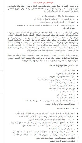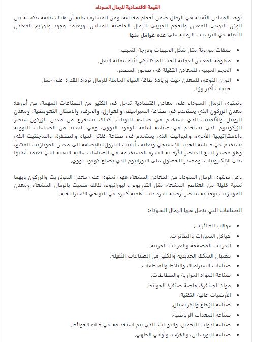 دراسة المركز المصري للفكر والدراسات الاستراتيجية ما هي القيمة الاقتصادية للرمال السوداء؟ تحتوي الرمال السوداء على معادن اقتصادية تدخل في الكثير من الصناعات المهمة، ومن أبرزها: معدن الزركون ومعدن الروتيل والألمنيت، وكذلك يستخرج منه معدن الزركون وعنصر الزركونيوم، ومعدن الجرانيت والماجنتيت، بالإضافة إلى معدن المونازيت المشع، واليورانيوم. وعن احتواء الرمال السوداء على المعادن المشعة، فهي تحتوي على معدن المونازيت والزركون وبهما نسبة قليلة من العناصر المشعة، مثل الثوريوم واليورانيوم، لذلك سميت بالرمال المشعة، ومعدن المونازيت يوجد به عناصر أرضية نادرة ذات أهمية كبيرة في النواحي الاستراتيجية.