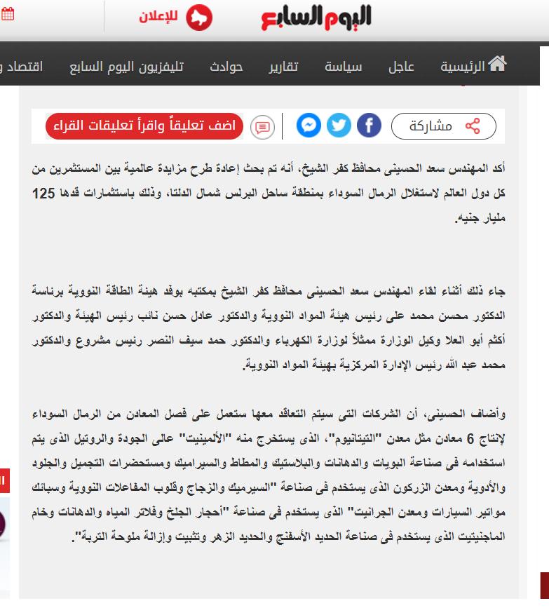 تصريحات رئيس هيئة المواد النووية عام 2012 وفي سبتمبر 2012، أكد المهندس سعد الحسيني محافظ كفر الشيخ وقتها، أنه تم بحث إعادة طرح مزايدة عالمية بين مستثمرين من كل دول العالم لاستغلال الرمال السوداء بمنطقة ساحل البرلس شمال الدلتا، وذلك باستثمارات قدرها 125 مليار جنيهًا.