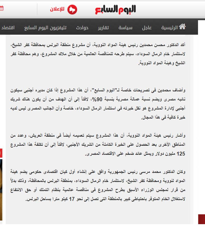 تصريحات رئيس هيئة المواد النووية وفي 4 فبراير 2013، أكد رئيس هيئة المواد النووية، في تصريحات لـ"اليوم السابع" أن مشروع منطقة البرلس بمحافظة كفر الشيخ، لاستثمار خام الرمال السوداء، سيتم طرحه للمناقصة العالمية من خلال ملاك المشروع، وهم محافظة كفر الشيخ وهيئة المواد النووية، موضحًا أن هذا المشروع إذا كان مديره أجنبي سيكون نائبه مصري ويضم نسبة عمالة مصرية بنسبة 90%.