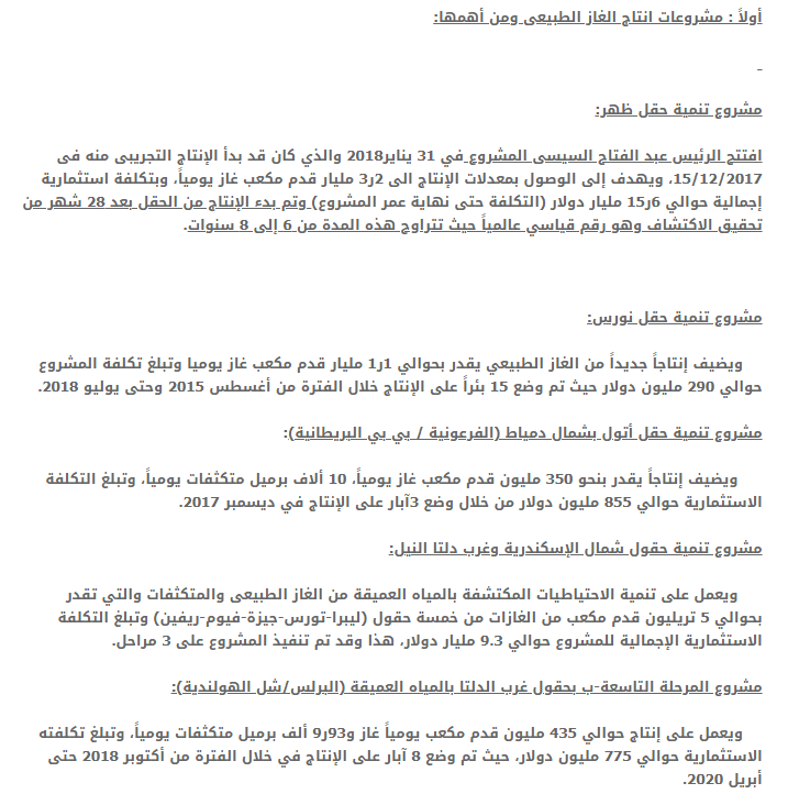 وهو ما كرره خِلال تصريحات صحفية في اليوم ذاته، إذ قال إن مصر أصبحت تصدر غاز بـ500 مليون دولار شهريًا بعد أن كانت تستورده بـ300 مليون دولار شهريًا.