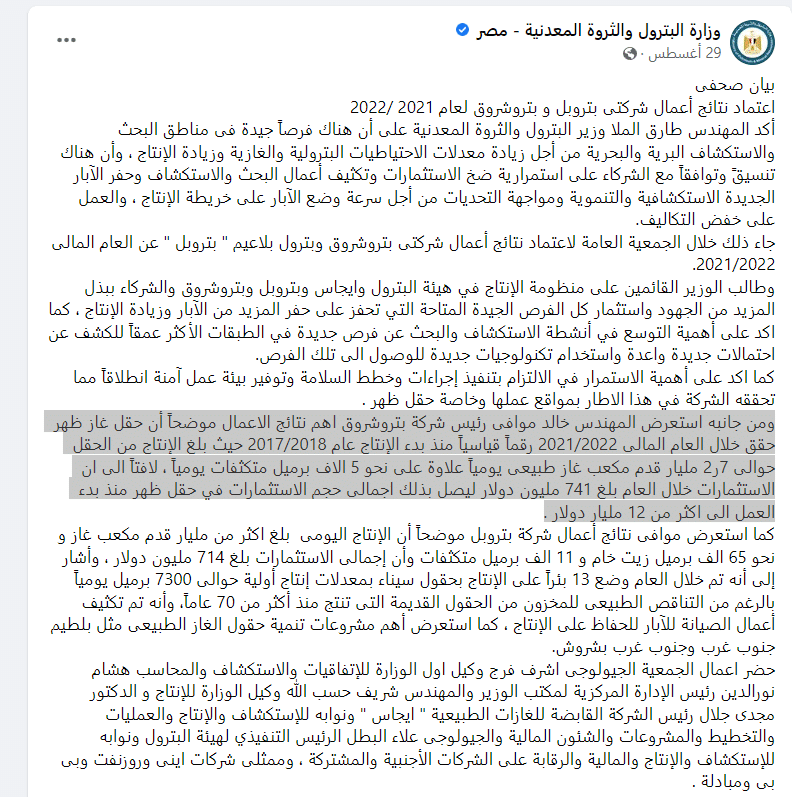 بيان صحفي لوزارة البترول والثروة المعدنية