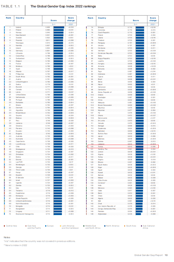 ترتيب تونس العالميّ في الفجوة بين الجنسين في 2022 تتبّع فريق عمل "تفنيد" تصريح دنيا العلّاني، وتوصّل إلى أنّه "غير دقيق"، حيثُ تحظى تونس بالمرتبة الثالثة عالميّا من أصل 133 بلدًا شملهم الترتيب، على مستوى تمثيل المرأة في الهيئات التداوليّة المحليّة، وذلك وفق ما يُظهره تقرير صادر عن هيئة الأمم المتّحدة للمرأة في ديسمبر 2021.