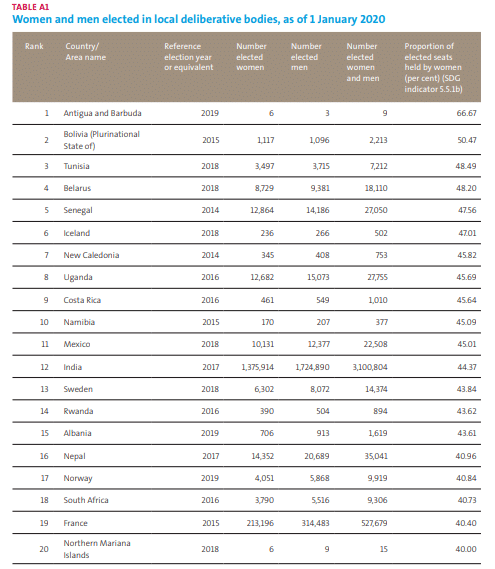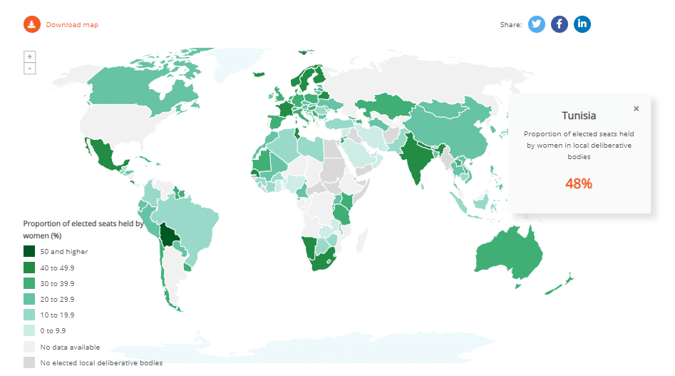 بالعودة لبيانات الأمم المتحدّة اكتشفنا أن تونس هي الثالثة عالميًا في تمثيل المرأة في المجالس البلديّة فقط بينما تحتل المرتبة الـ77 عالميًا في تمثيلها بالبرلمان