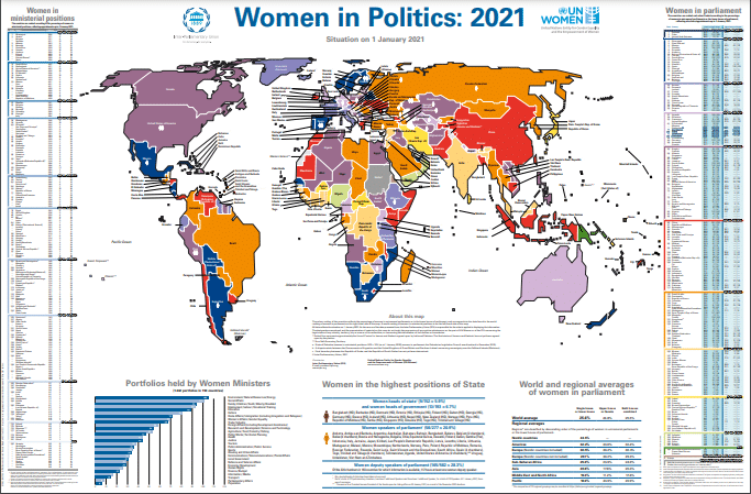 خريطة المرأة في السياسة لسنة 2021 وتُظهر الخريطة أنّ كلّ من رواندا وكوبا والإمارات العربيّة المتّحدة هي الدول التي تحتل المراكز العالميّة الثّلاث الأولى على التّوالي في تمثيل المرأة في البرلمانات في عام 2021 بنسب لا تقلُّ عن 50%.