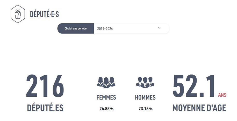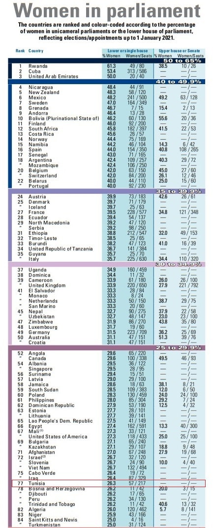ترتيب تونس العالميّ في تمثيل المرأة في البرلمان لسنة 2021 وتتوافقُ نّسبة تمثيل النّساء التونسيّات في البرلمان التّي أوردتها هيئة الأمم المتّحدة في تقريرها لسنة 2021 مع بيانات رسميّة لـ"مرصد مجلس" التّابع لمنظّمة البوصلة، والتّي تُفيد بأنّ النّساء يُمثّلن 26.85% من مجموع النّواب في مجلس نوّاب الشّعب التّونسي في الفترة النيابيّة 2019- 2024.