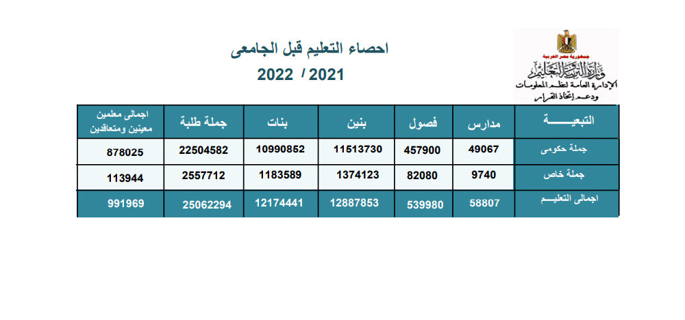 ووفقًا لإحصاءات مركز معلومات وزارة التربية والتعليم لعام 2021 ـ 2022، بلغ عدد الطلاب 25 مليونًا و62 ألفًا و294 طالبًا، وعدد المدارس بلغ 58 ألفًا و807 مدارس، تضم 539 ألفًا و980 فصلًا. بينما في عام 2020 ـ 2021، بلغ عدد الطلاب 24 مليونًا و403 ألفًا و924 طالبًا وعدد المدارس 57 ألفًا و749 مدرسةً وتضم 518 ألفًا و553 فصلاً. وفى عام 2019 ـ 2020، بلغ عدد الطلاب 23 مليونًا و567 ألفًا و60 طالبًا وعدد المدارس 56 ألفًا و569 مدرسةً وتضم 509 آلاف و471 فصلاً. [gallery jnewsslider_title="إحصاءات وزارة التربية والتعليم المصرية" size="full" ids="12908,12909,12910"]