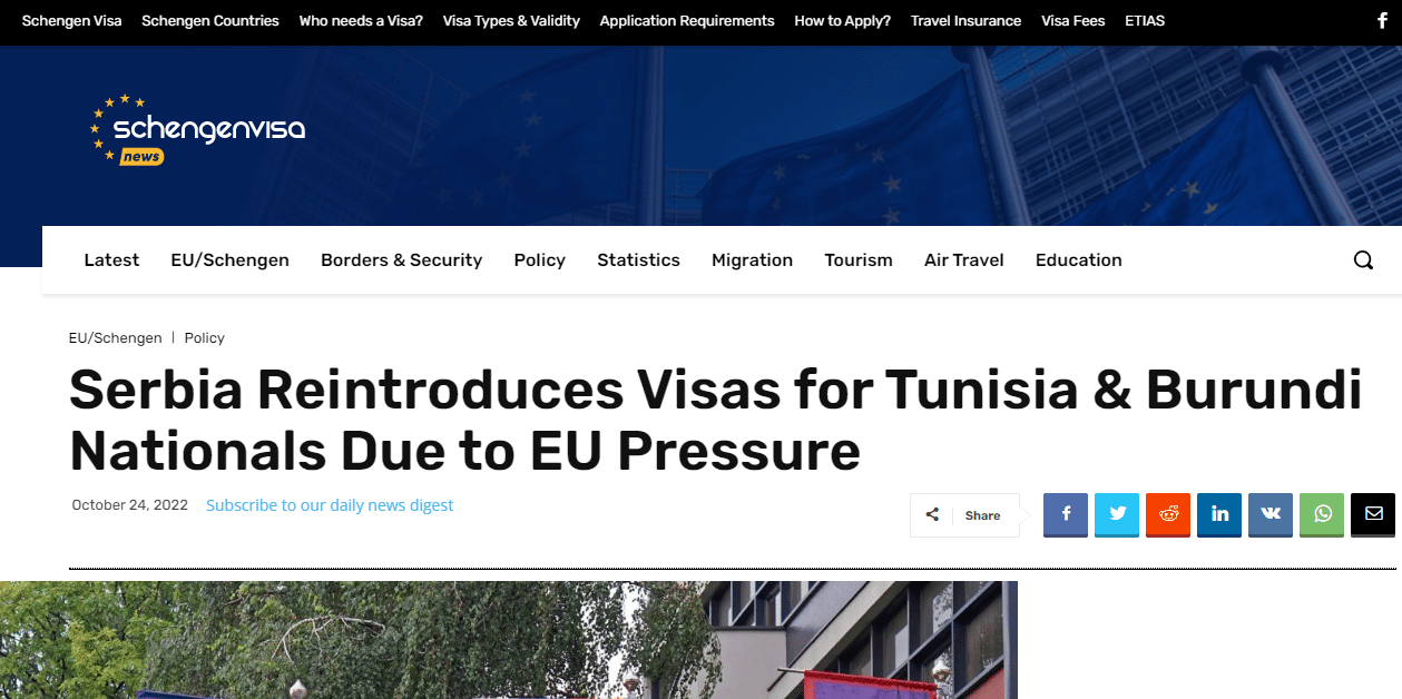 كما أكّد الموقع الخاص بالتأشيرة لدول الاتحاد الأوروبي "الشنغن" "SchengenVisaInfo.com" قرار صربيا باعتماد التأشيرة على التونسيين والبورنديين، مرجعًا ذلك إلى الضغوطات التي فرضتها دول الاتحاد الأوروبي على الجانب الصربي، بعد تزايد أعداد المهاجرين الواصلين إلى الأراضي الأوروبية عن طريق البلقان.