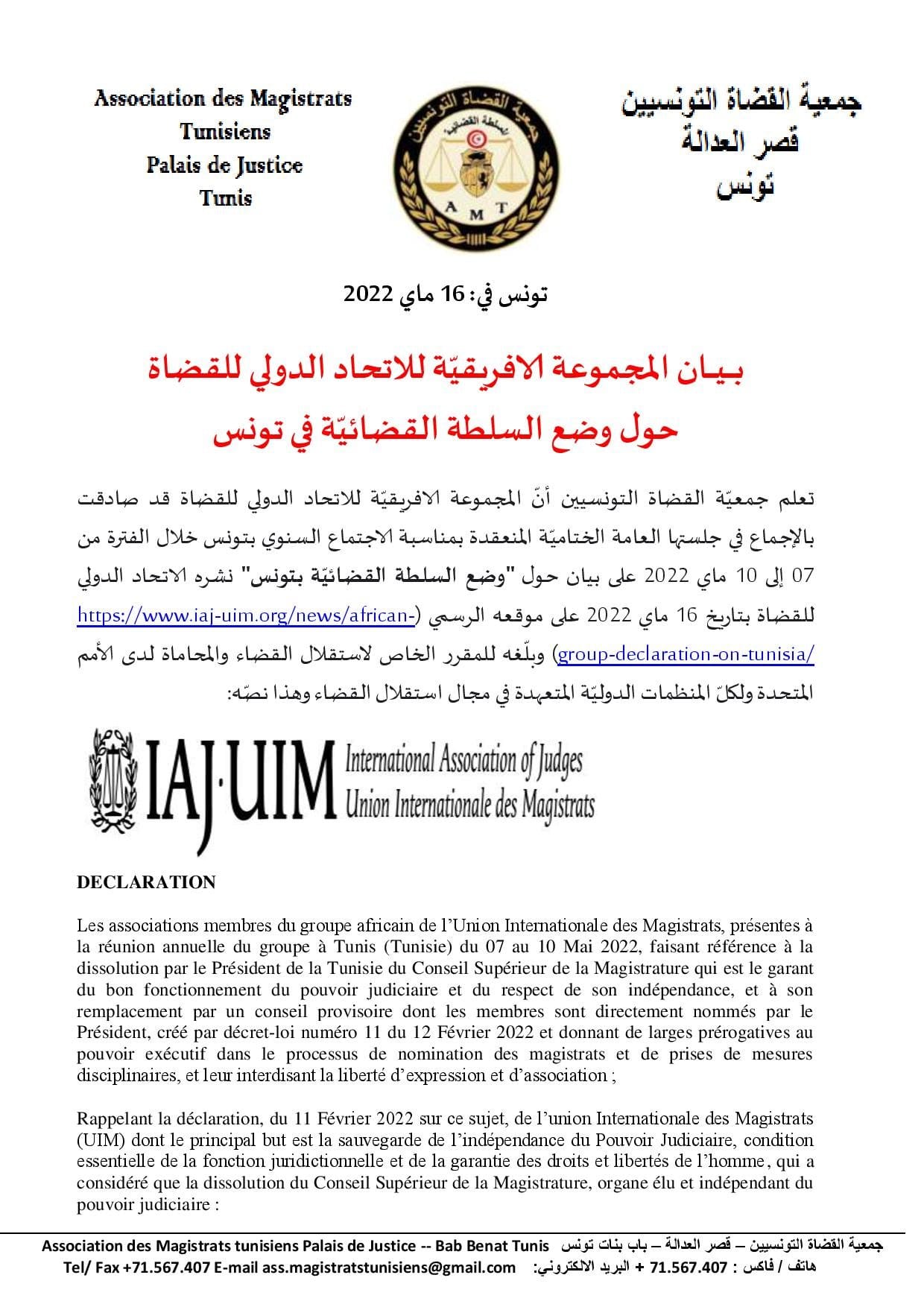 لم يكن السجال بين الرئيس والقضاء في تونس بمعزل عن العالم، حيث أصدرت المجموعة الإفريقيّة للاتحاد الدولي للقضاة، بيانًا حول وضع السلطة القضائيّة بتونس، ونددت خلاله بحلّ المجلس الأعلى للقضاء في تونس، معتبرة أن ذلك "يقوّض بشكل خطير سيادة القانون التي تتميز بالفصل بين السلطات التنفيذية والتشريعية والقضائية، بحسب ما جاء في البيان.