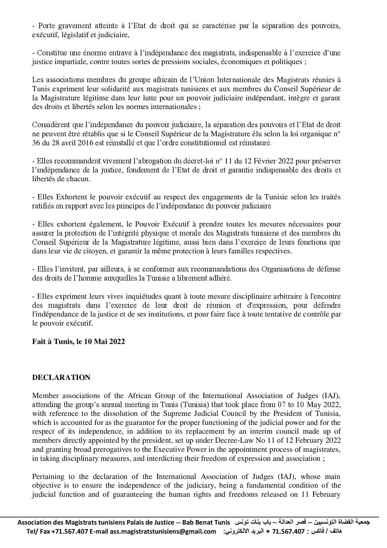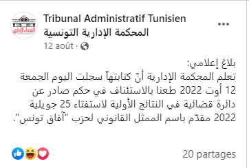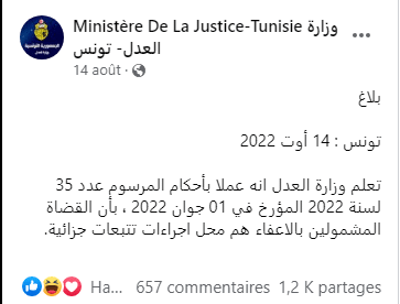 كما نشرت المحكمة الإدارية التونسية بيانًا يوم 10 أغسطس 2022، أعلنت فيه وقف تنفيذ قرارات إعفاء عددًا من القضاة.