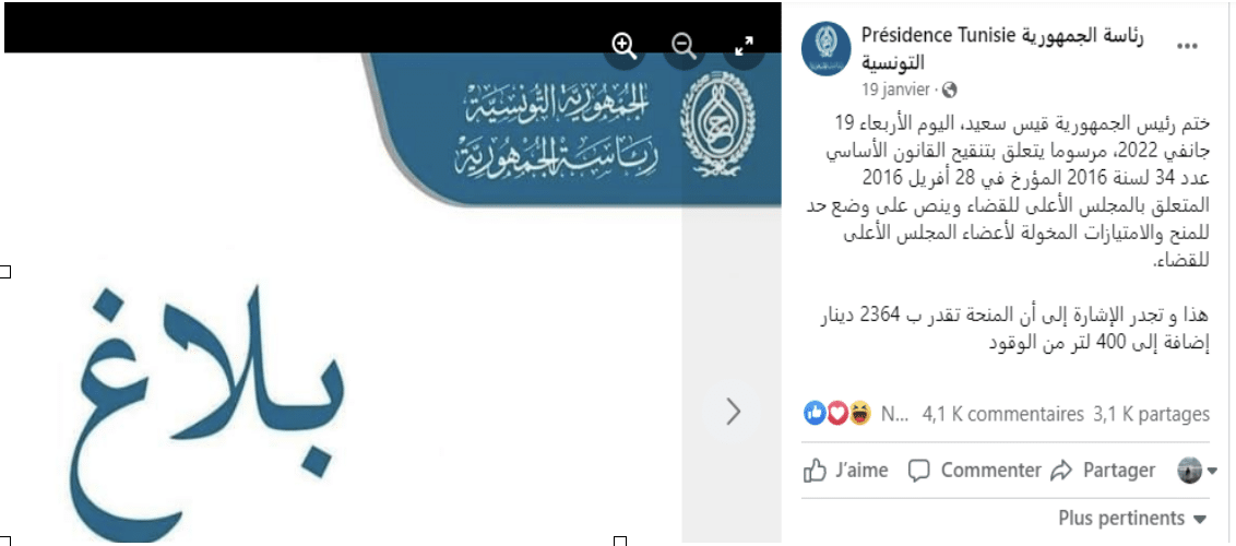 وفي 19 يناير 2022، نشرت رئاسة الجمهورية بيانًا أعلنت عبره عن وضع حد للمنح والامتيازات المخولة لأعضاء المجلس الأعلى للقضاء، عبر المرسوم عدد 4 بتاريخ 19 يناير 2022 لتنقيح القانون الأساسي رقم 34 لسنة 2016 المؤرخ في 28 أبريل 2016 الخاص بالمجلس الأعلى للقضاء.