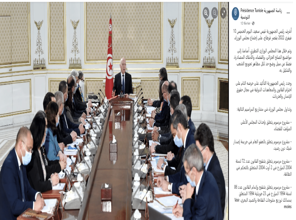 وخرج الرئيس التونسي بفيديو من مقر وزارة الداخليّة، يوم 6 فبراير 2022، أعلن فيه حل المجلس الأعلى للقضاء، قائلا:" سنعمل على وضع حد لهذا الوضع المزري وسنعمل على وضع مرسوم مؤقت للمجلس الأعلى للقضاء.. فليعتبر هذا المجلس نفسه في عداد الماضي من هذه اللحظة".