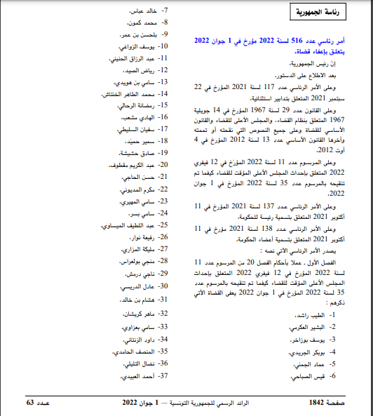 لم يقف التوتر بين الرئيس والقضاة عند حلّ المجلس الأعلى للقضاء، بل أصدر يوم 1 يونيو 2022 الأمر الرئاسي رقم 516 والذي يقضي بإعفاء 57 قاضيًّا من مهامهم.