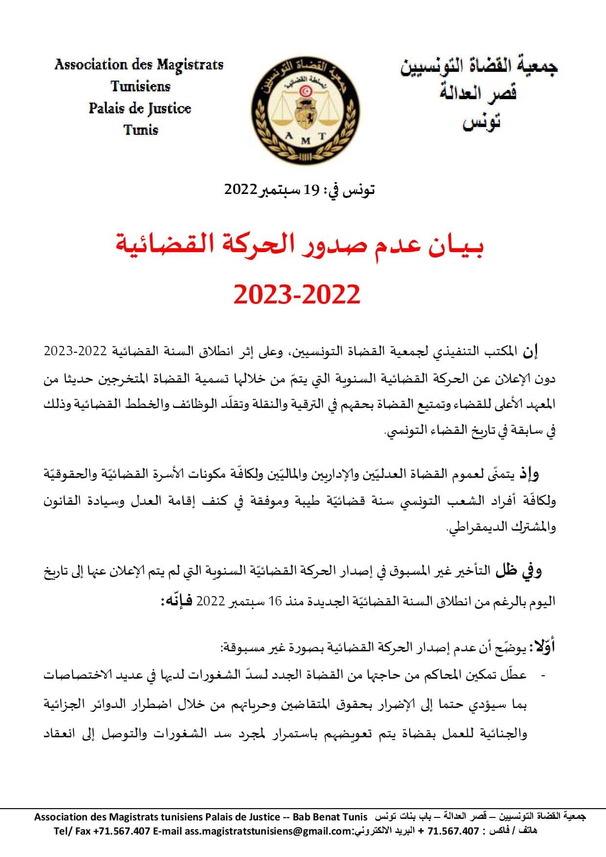 كما أصدرت جمعية القضاة التونسيين، بيانًا يوم 19 سبتمبر 2022، بعنوان "بيان عدم صدور الحركة القضائية"، أوضحت من خلاله أن عدم إصدار الحركة القضائية بصورة غير مسبوقة عطّل تمكين المحاكم من حاجتها من القضاة الجدد لسدّ الشغور لديها، والإضرار بحقوق المتقاضين وحرياتهم.