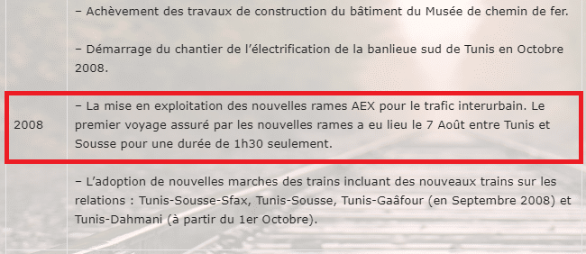 وفي عام 2008، تسلّمت تونس 10 قطارات سريعة (Autorails Express) من نوع «Diesel AM 800» تمّ تصنيعها من قبل الشركة الفرنسيّة «Chemin de Fer Départementaux- CFD» في صفقة قُدّرت قيمتها بـ35 مليون يورو، وفق تقرير لمجلّة «Le Rail Maghreb» في نوفمبر 2008، وهو ما يتعارضُ مع تصريح خميّس صقر، الذّي أفاد فيه بإنّ هذه الصّفقة تمّت في 2007.